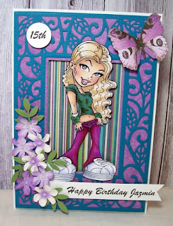 I rather like these Kenny images for teen girls. She was the wrong colour, as it was requested teal and lavender, so I recoloured her using my Kaiserfusion Alcohol Pens. The die is a Sue Wilson Background Die, Scattered Leaves, CED7103. The little flowers are from Green Tara. Grandma was thrilled and assured me she just looked like Jazmin. Another fun card!